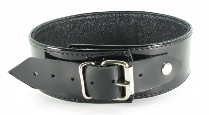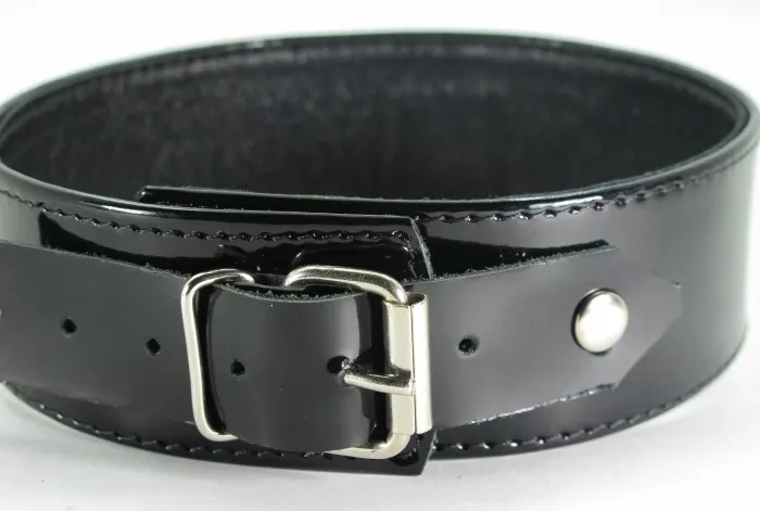 Ошейник черного цвета, выполнен из высококачественной кожи/лак. Ширина фетиш атрибута составляет 3,7 сантиметров. Размер регулируется при помощи застежек с делениями. Для крепления различных элементов бандажа, а также поводков и цепочек на БДСМ девайсе предусмотрено одно сварное D-видное кольцо. Общая длина ошейника - 42 см. Упаковка- картонная подложка.