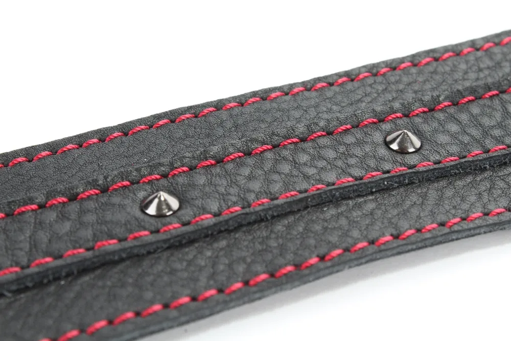 Черный кожаный ошейник с красной отстрочкой. Декорирован небольшими шипами в передней части изделия. Имеет D-кольцо для карабина. Характеристика: ширина ошейника - 5 см, общая длина ошейника- 41см. Имеет 7 отверстий для регулировки размера.