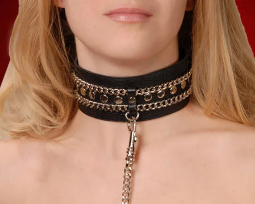 Изготовлен из натуральной кожи с велюровой подкладой. При изготовлении использована никелированная фурнитура. Ширина ошейника 50 мм, длина цепочки (поводка) с карабином 50 см. Размер универсальный. Один из основных атрибутов BDSM.