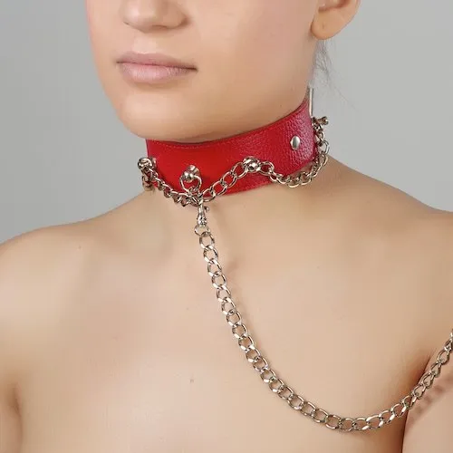Ошейник красный, с металлической цепочкой по окружности и с цепочкой-поводком. Диаметр регулируется с помощью ремешка. Материал заменитель кожи. Упаковка пластиковая прозрачная коробка.