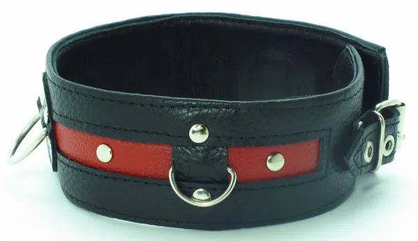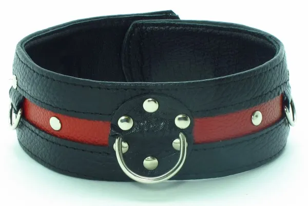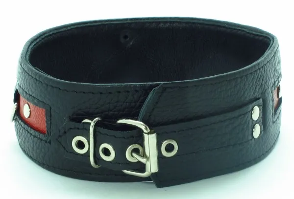 Черный кожанй ошейник с контрастной красной вставкой и заклепками. Имеет три кольца. Ширина - 5 см, Размер регулируется при помощи застежки.