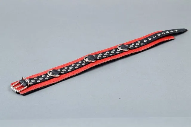 Ошейник выполнен из натуральной кожи высокого качества и декорирован геометрическим рисунком из двух видов заклепок. Он оснащен тремя D - кольцами, которые обеспечивают удобство крепления различных бандажных систем (карабины, веревки, ленты). Мягкая подкладка обеспечит максимальный комфорт и безопасность при использовании. Застегивается BDSM ошейник  на ремешок с пряжкой. Поводок в комплект не входит.