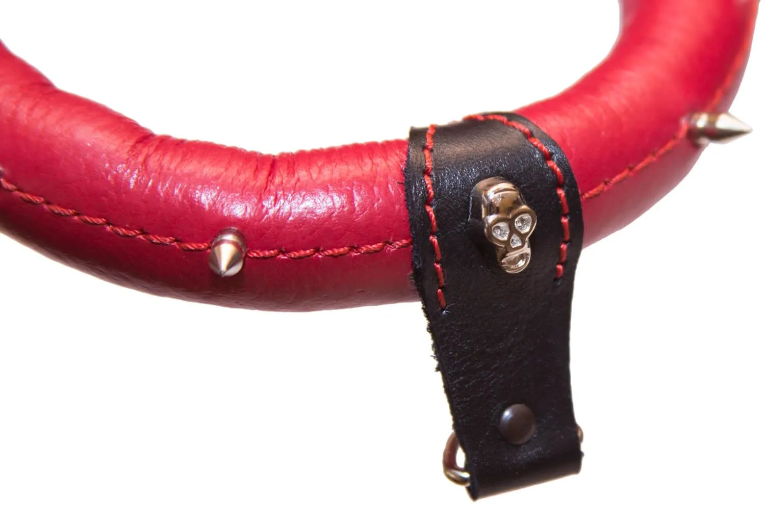 Поклонникам ролевых интимных игр придется по вкусу красный кожаный ошейник. Он декорирован металлическими шипами и небольшим черепом, благодаря которым он выглядит невероятно эффектно. У ошейника есть небольшое колечко, за которое его можно пристегнуть к поводку (в комплект не входит) за небольшой карабин, чтобы добавить играм еще большее разнообразие. Изделие прекрасно подойдет для БДСМ развлечений и позволит реализовать самые нескромные сексуальные фантазии.