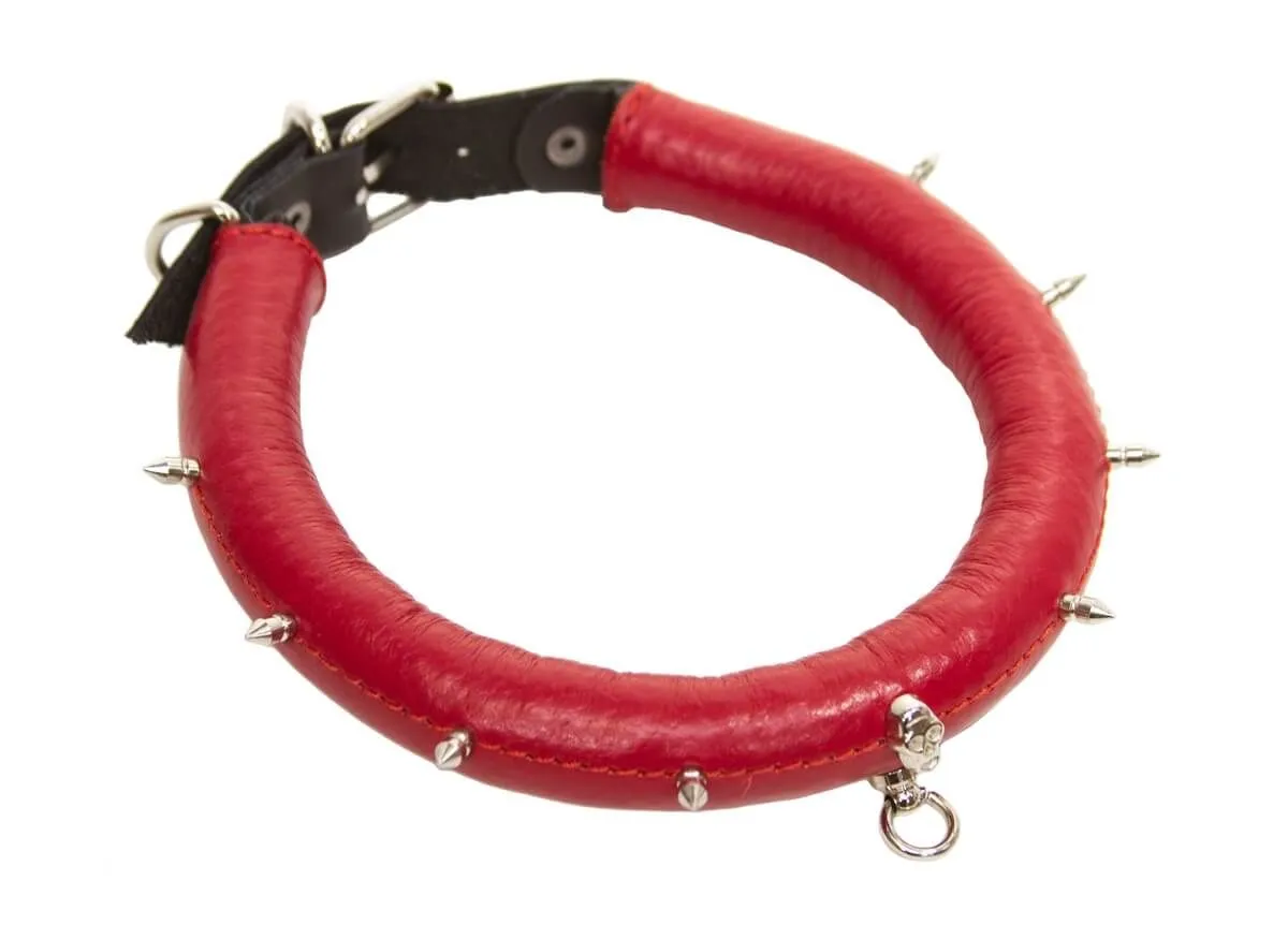 Поклонникам ролевых интимных игр придется по вкусу красный кожаный ошейник. Он декорирован металлическими шипами и небольшим черепом, благодаря которым он выглядит невероятно эффектно. У ошейника есть небольшое колечко, за которое его можно пристегнуть к поводку (в комплект не входит) за небольшой карабин, чтобы добавить играм еще большее разнообразие. Изделие прекрасно подойдет для БДСМ развлечений и позволит реализовать самые нескромные сексуальные фантазии.