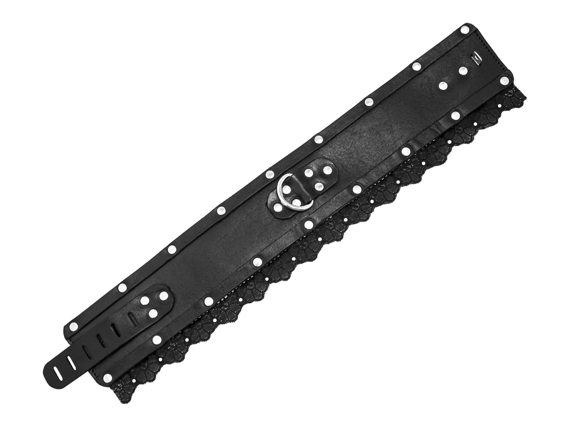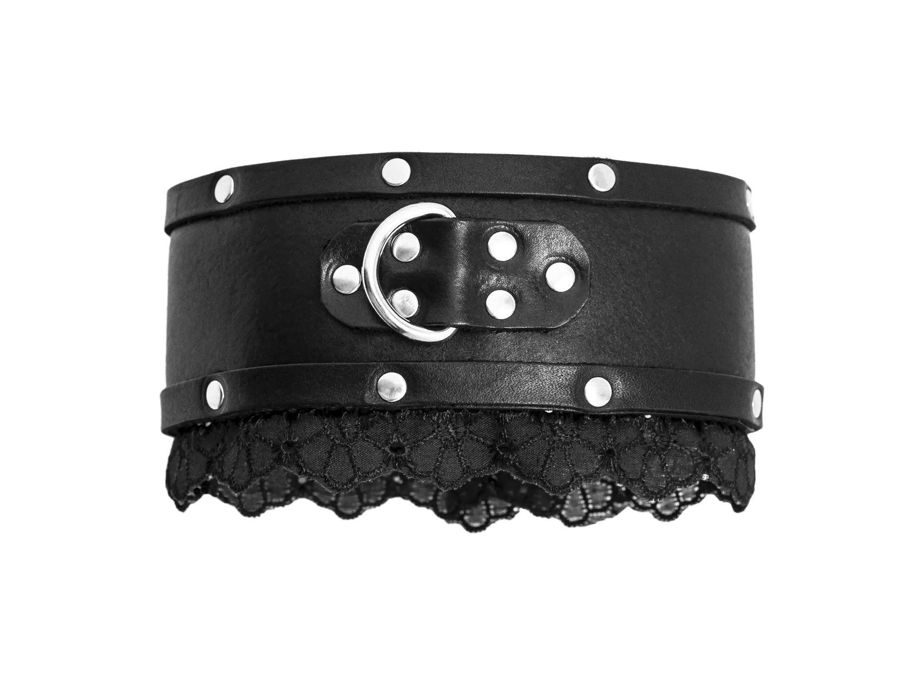 Ошейник выполнен из натуральной кожи и украшен металлическим заклепками и нежным кружевом. У него есть кольцо, к которому можно прикрепить поводок или различные бондажные системы.