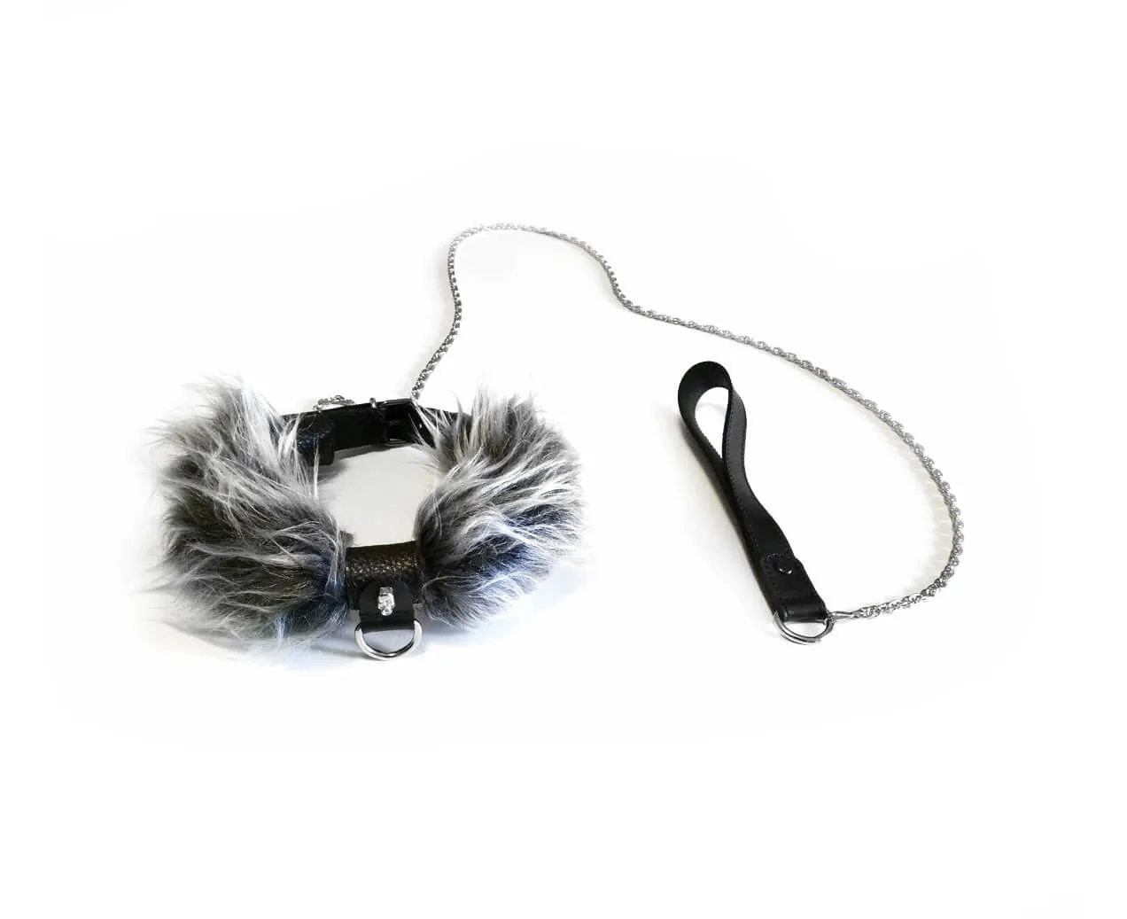 Ошейник выполнен из натуральной кожи черного цвета и мягкого искусственного меха серого цвета. Также в комплекте есть поводок на цепочке, который пристегивается к кольцу на ошейнике при помощи карабина. Ошейник можно регулировать по размеру при помощи ремешка с пряжкой. А благодаря приятному на ощупь меху он не повредит нежную кожу шеи. Длина поводка: 110 см.
