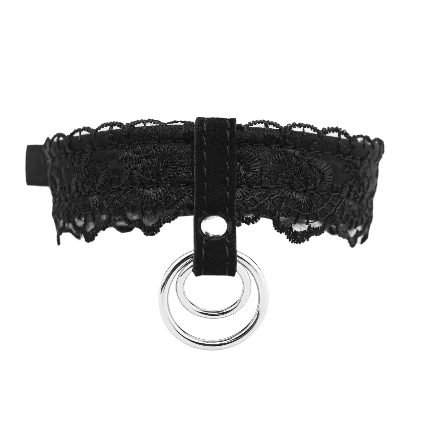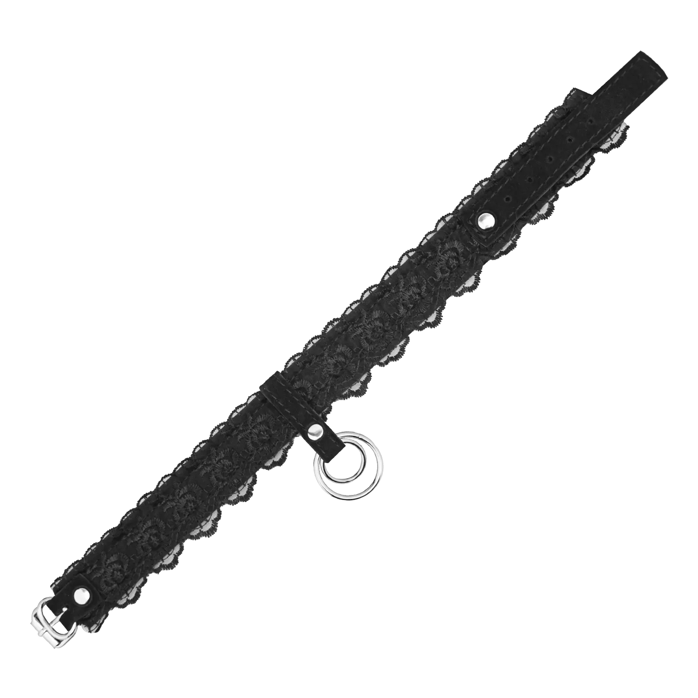 Ошейник выполнен из замши и декорирован черным кружевом. Такой аксессуар не только украсит собой шею Вашего партнера или партнерши, но и будет служить своеобразным символом подчинения. Благодаря двойному кольцу на ошейнике Вы сможете присоединить к нему поводок или другие бандажные аксессуары, чтобы поэкспериментировать с различными сценариями игры и вариантами фиксации.
