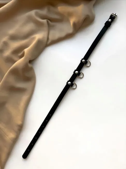 Чокер черного цвета из натуральной кожи будет прекрасным украшением, которое подчеркнет Ваш индивидуальный стиль и акцентирует внимание на прекрасной шейке. Также он сможет послужить Вам во время ролевых игр с элементами БДСМ, ведь благодаря трем небольшим металлическим кольцам к нему можно присоединить поводок или другие аксессуары. Это заметно разнообразит Ваши любовные игры и позволит испытать новые будоражащие ощущения.