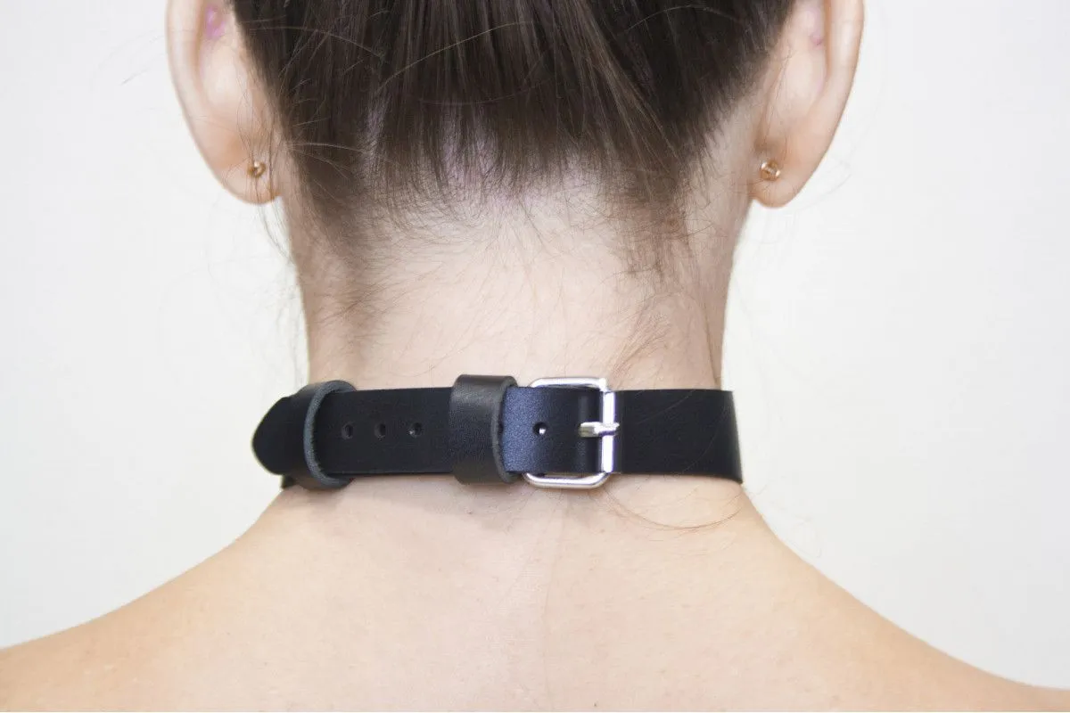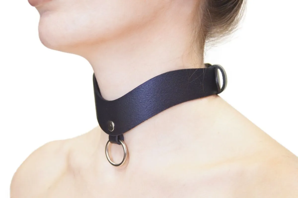 Ошейник стильной формы, единый отрез натуральной кожи и металлическое кольцо для поводка в центре.