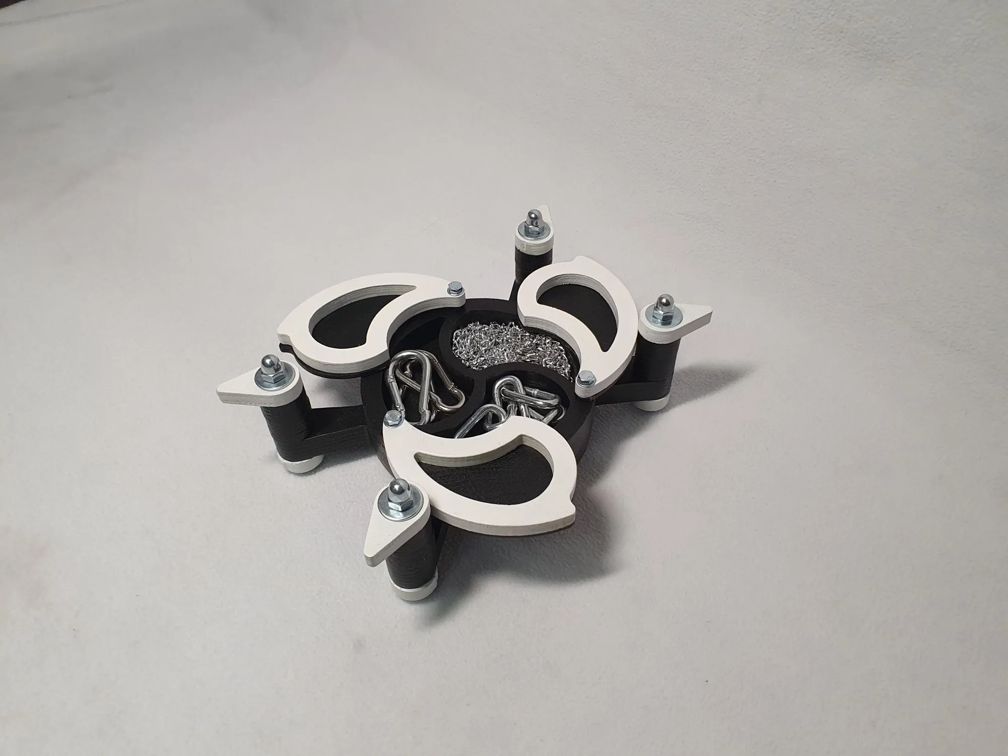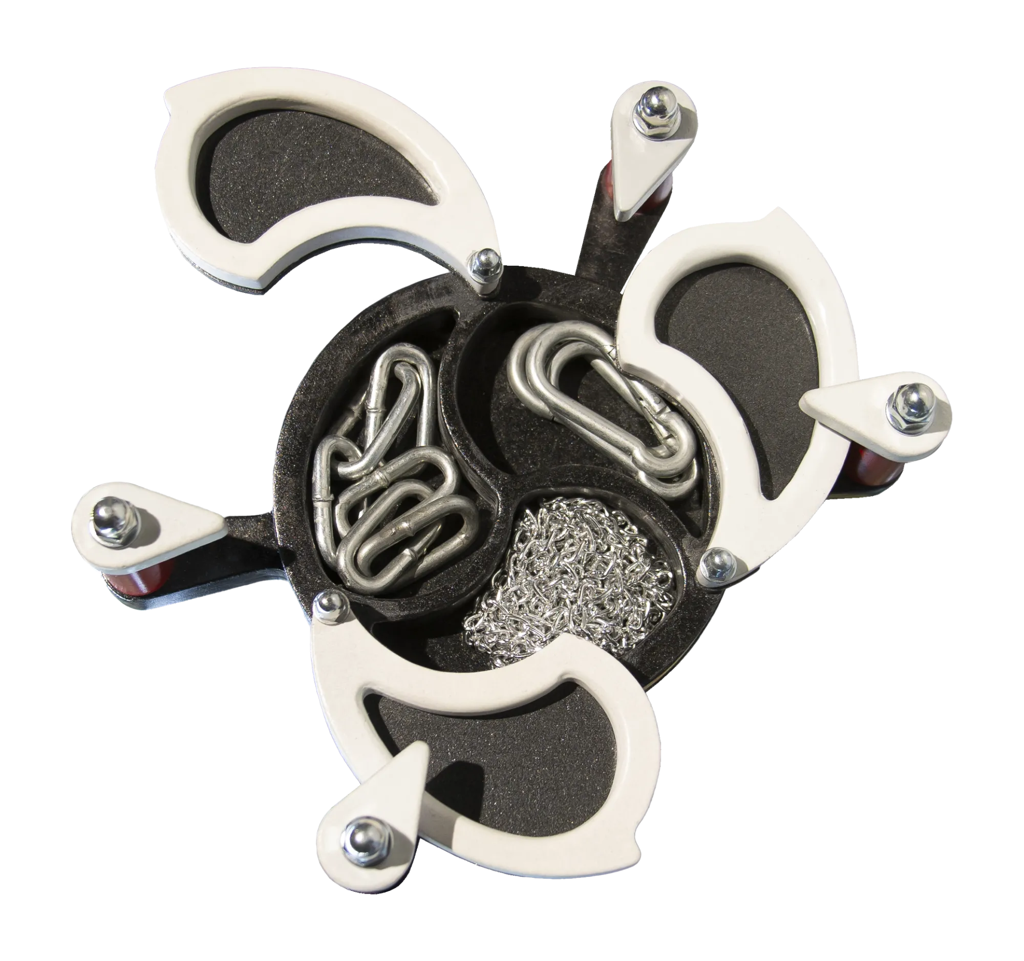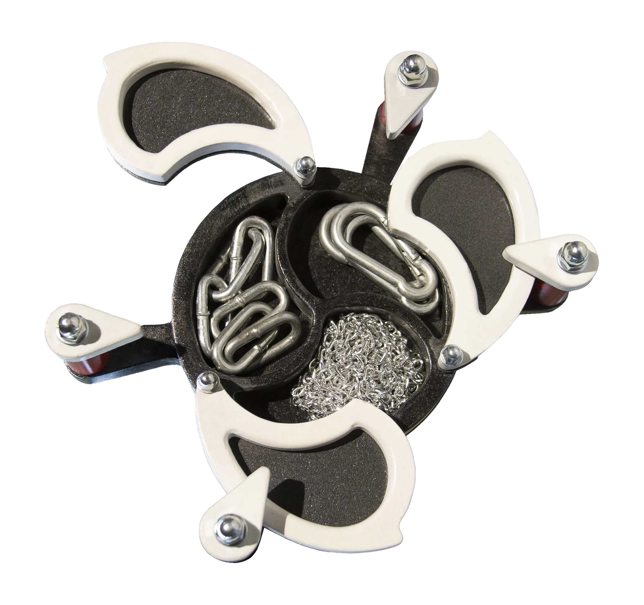 Твердотельный чокер утонченной формы, может быть использован как украшение или для БДСМ практик. С помощью него можно зафиксировать голову в одном положении, при этом не сдавливая шею. Для дополнения образа в наборе есть декоративные цепи, а также жесткие цепи с карабинами, которые позволяют соединять их с браслетами или напульсниками