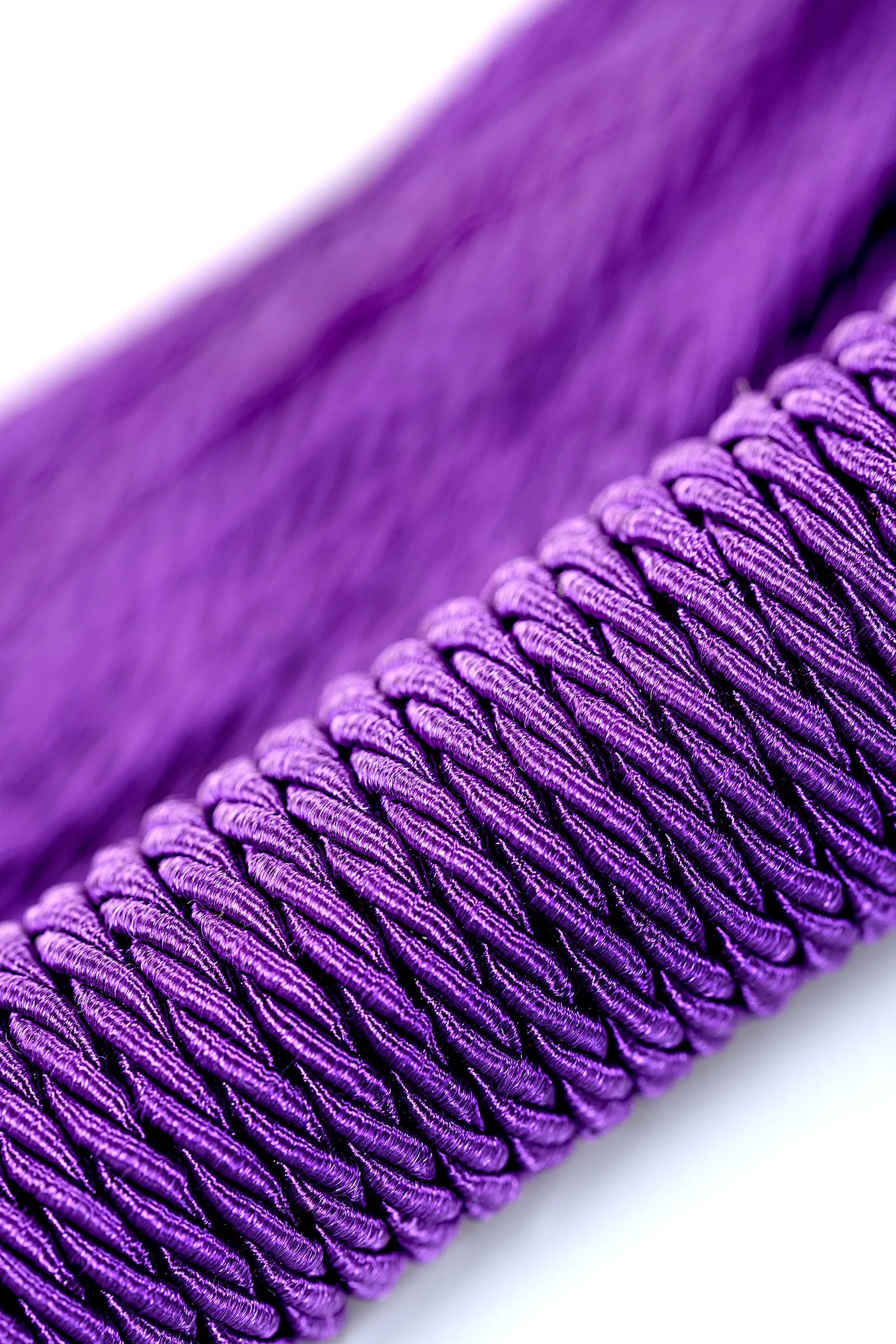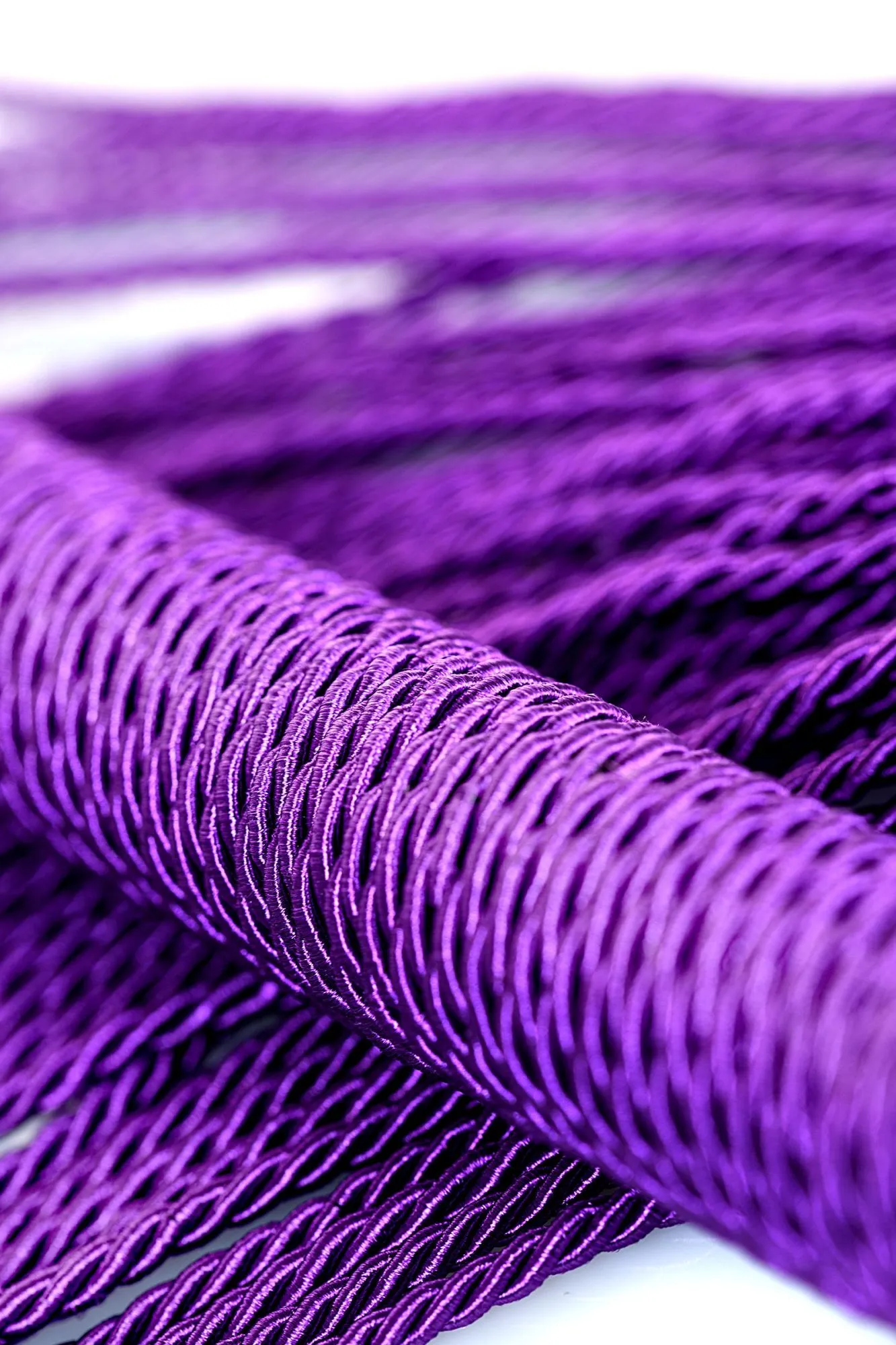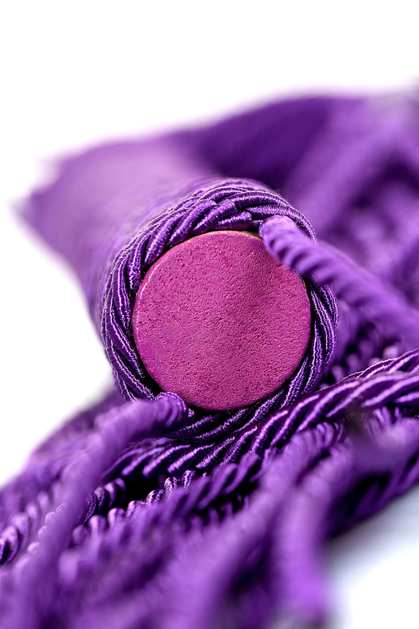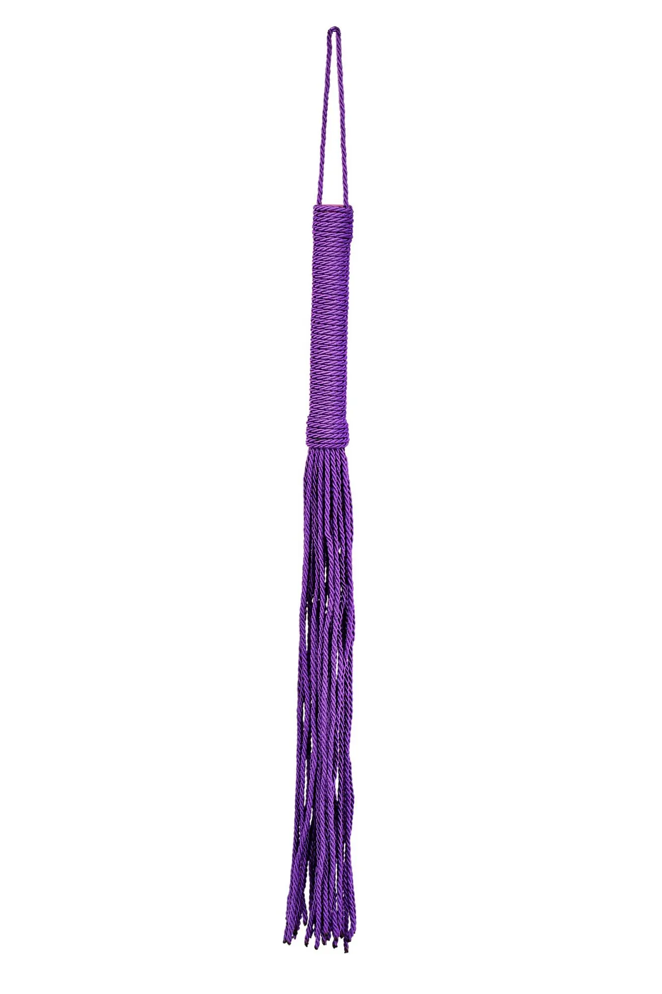 Сиреневый веревочный флоггер с плетеной ручкой мягко разогревает кожу и готовит к более серьезным воздействиям.