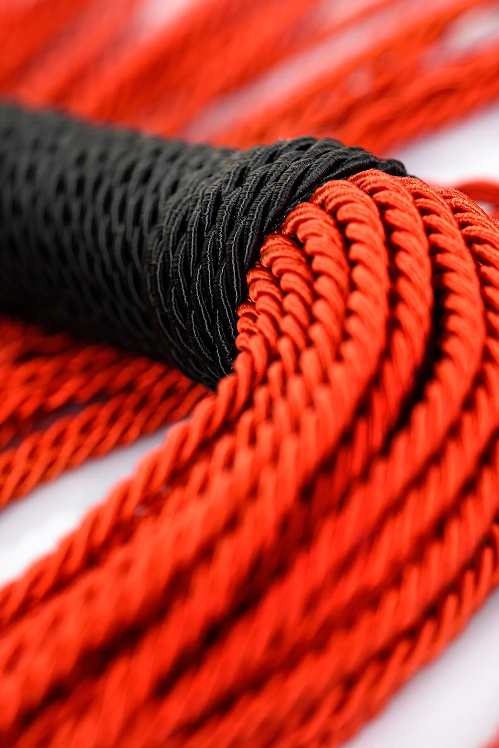 Веревочный флоггер с красными хвостами и черной плетеной ручкой мягко разогревает кожу и готовит к более серьезным воздействиям.