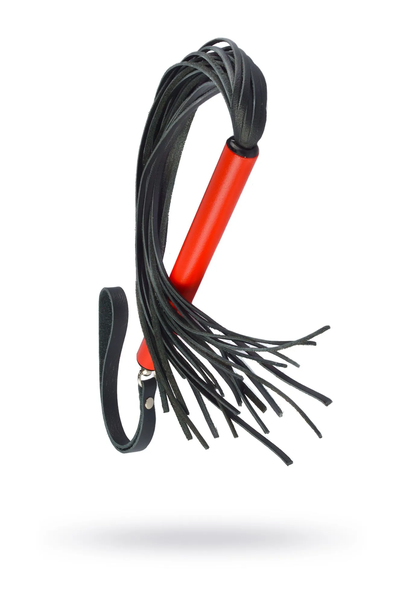 Небольшая плеть с хвостом из тонких 3-х мм лент натуральной кожи. Металлическая рукоять цилиндрической формы имеет диаметр 1,6 см, длину – 15 см. Общая длина изделия, без ремешка, 47 см. Цвет хвоста черный.