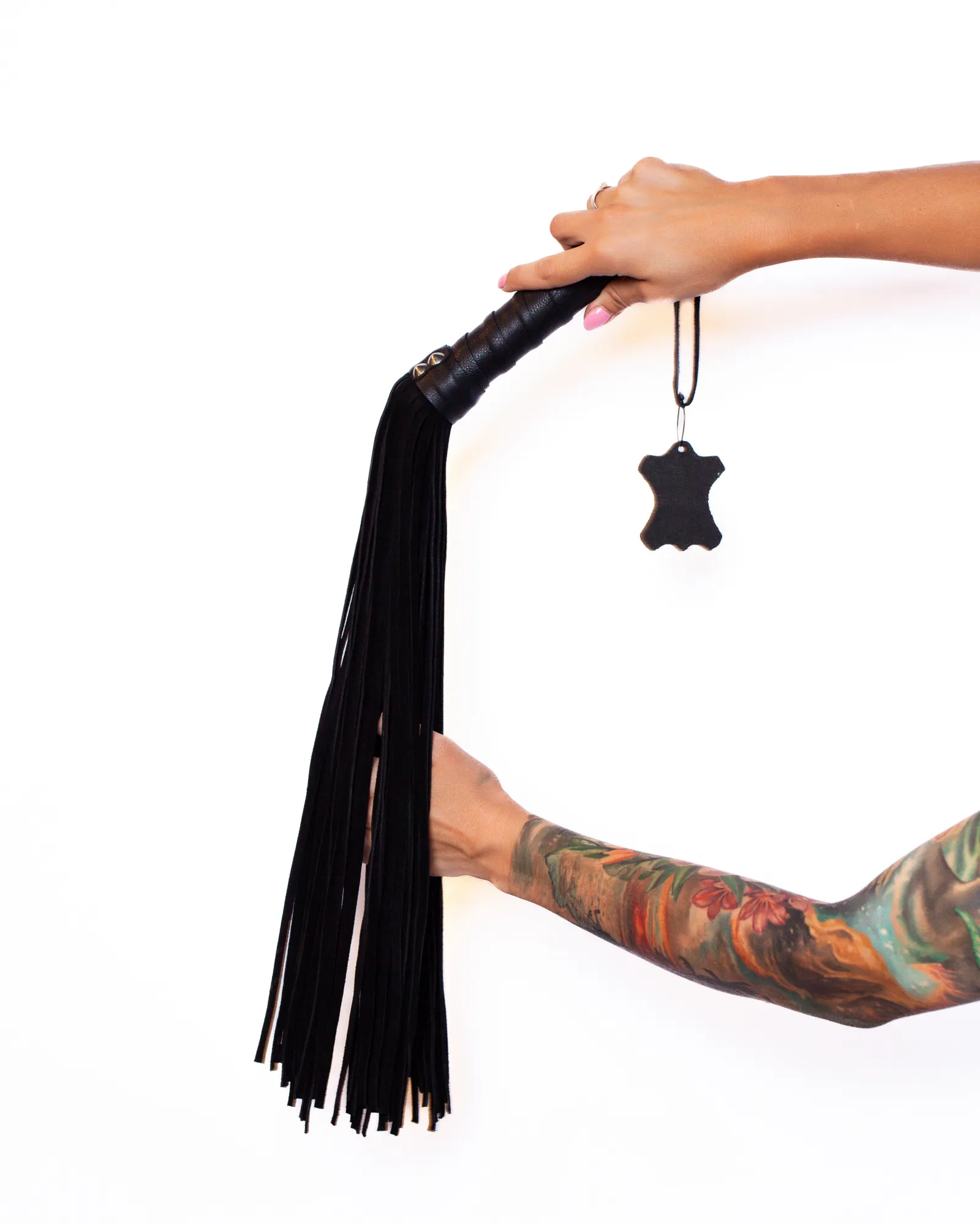 Элегантый флоггер с ручкой из натуральной кожи премиум качества и хвостом из мягкой натуральной замши. Флоггер имеет удобную рукоять с петлей для фиксации изделия на запястье.