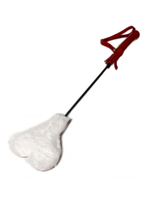 Миниатюрный и очень симпатичный стек из натуральной красной кожи, на конце которого расположен шлепок в виде сердечка. Одна сторона шлепка выполнена из натуральной кожи, а другая из нежнейшего белого эко-меха, невероятно приятного наощупь. Такой дизайн позволит чередовать возбуждающие шлепки кожаной стороной и нежные поглаживания меховой стороной. Общая длина аксессуара 36см, рукоятка длиной 9см,для удобства на рукоятке имеется петелька. Размеры шлепка 6х8см. Этот маленький, но гибкий и яркий стек добавит незабываемых эмоций и ощущений в любовную игру! Материал: натуральная кожа, эко-мех, металл, пластик