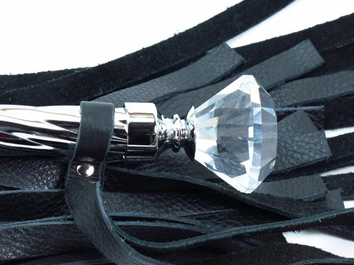 Великолепная плеть из кожи с жесткой рельефной рукоятью, украшенной кристаллом. Имеется ручка-петля для комфортного использования. Длина рукоятки - 20,5 см., длина хлыстов - 40 см.