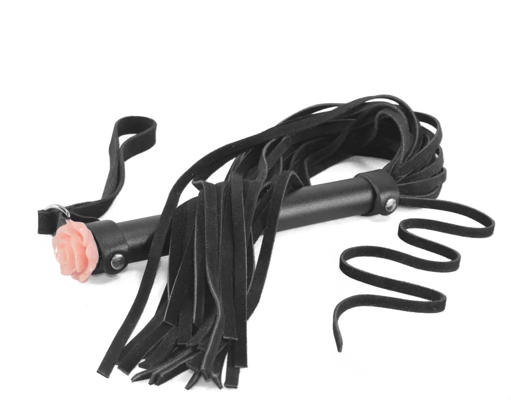Плеть изготовлена из натуральной велюровой кожи. Цвет черный. Торец металлической рукояти украшен акриловой розой. Общая длина 57-60 см. Количество лент в хвосте 25-26. Длина рукояти 17 см, длина хвостовой части 39 см.