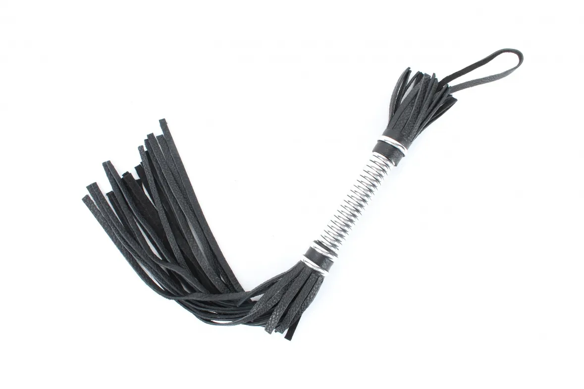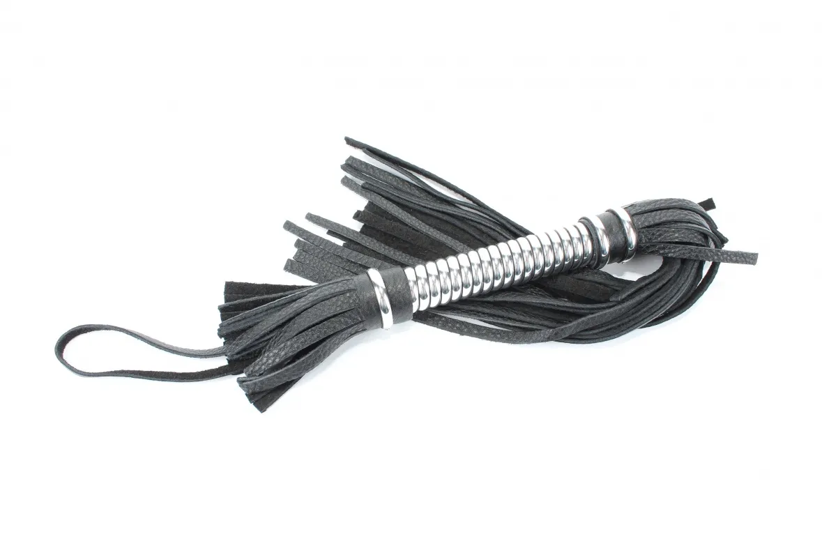 Аккуратная черная плетка, изготовленная из натуральной кожи. Имеет жесткую витую рукоятку серебряного цвета длиной 16 см.. Имеется петля для удобного использования плети. Длина хлыстов - 28 см.