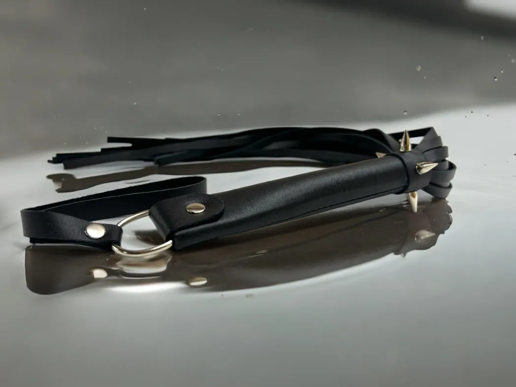 Плеть Risky Arsenal - идеальный вариант для любителей острых ощущений и ярких переживаний во время любоной игры! Аксессуар выполнен из натуральной черной кожи высокого качества, имеет необычную стильную форму рукоятки, которая дополнительно декорирована металлическими шипами. Предлагаем включить фантазию и поиграть с плетью не только стандартным способом: можно завязать партнеру глаза и использовать шипастую рукоятку в качестве своеобразного колеса Вартенберга, что может очень круто разнообразить сценарий. Общая длина аксессуара 55см, длина хвостов 40см, их количество 25 штук. Для удобства на рукоятке имеется кожаная петелька.