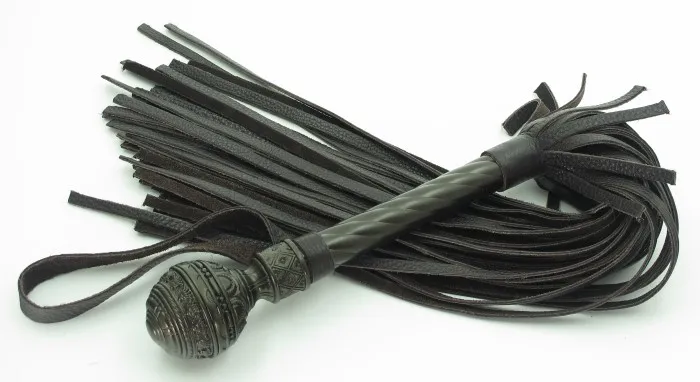 Величественная плеть из натуральной кожи, с жесткой рукояткой, украшенной эксклюзивным кованым скипетром.Имеет удобную петлю для комфортного использования. Длина рукоятки - 22,5 см., длина хлыстов - 40 см.
