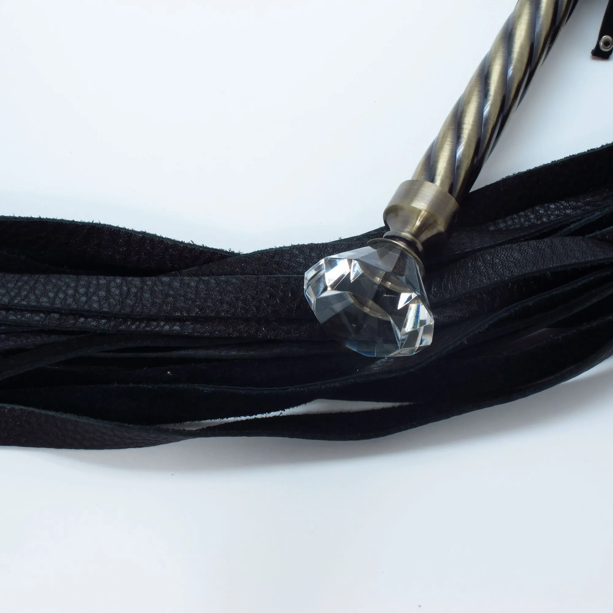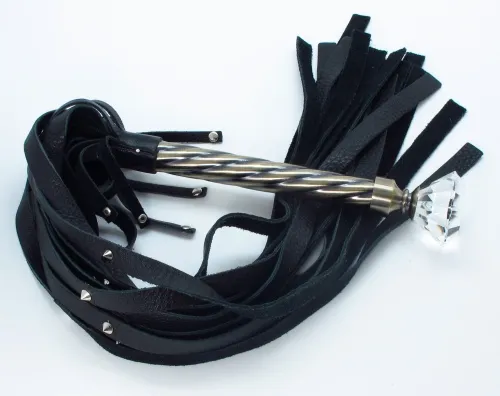 Плеть с рельефной металлической рукояткой из натуральной кожи. Рукоятка из металла с ручкой в виде большого кристала и кожаным ремешком, Длина плети- 40 см, рукоятки- 21 см, длина хлыстов - 58 см