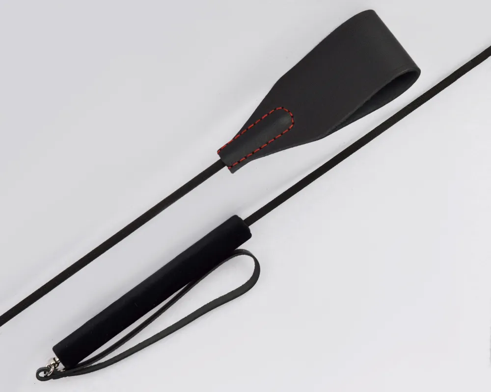 Петлеобразная хлопушка стека изготовлена из натуральной кожи высокого качества, располагается на конце гибкого, но прочного хлыста. Ремешок-петля, находящийся на рукояти, позволяет дополнительно фиксировать стек на запястье.
