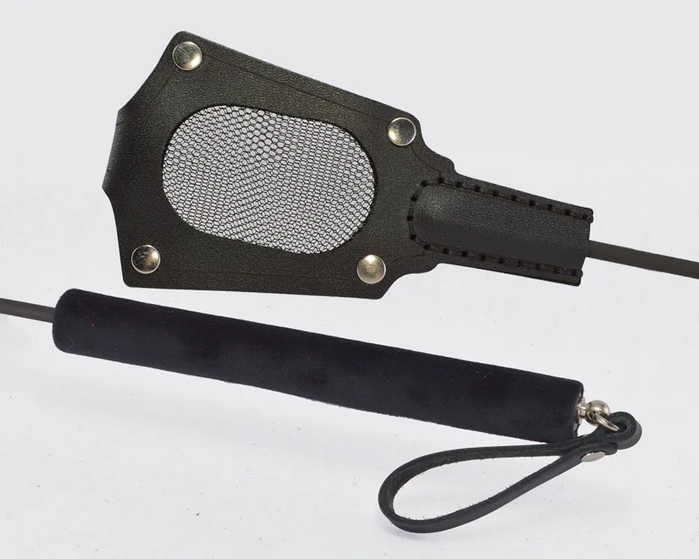 Стек состоит из жесткой рукояти, длиной 15 см, гибкого полимерного хлыста и  хлопушки из натуральной кожи с гламурной вставкой из прозрачной сеточки, рукоять для комфортного применения имеет бархатистую, приятную на ощупь поверхность. Общая длина стека 65