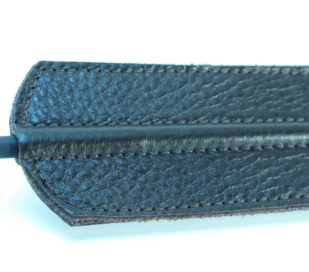 Стек сделан из прочного сердечника с оплетением из кожи. Наконечник в виде хлопушки из кожи для осуществления ударов. Девайс отлично подходит для БДСМ игр. Мягкая и гибкая конструкция позволяет избежать повреждений тела даже при сильных ударах. Характеристики: длина БДСМ девайса составляет 79 см, хлопушка сделана из подшитой кожи, шириной 5 см, длиной 40 см, рукоятка стека жёсткая. Страна - Россия. Без упаковки.