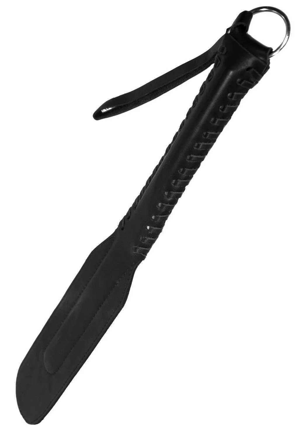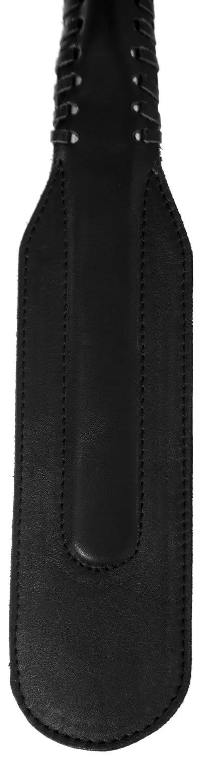 Черного цвета узенькая хлопалка от компании "Подиум" имеет удобную рукоятку, оплетенную по краю кожаной полоской, отчего аксессуар выглядит красиво и стильно. Пружинящая вставка из полимерного материала придает спанкеру гибкость. Применять его можно для работы по ягодицам и по верхним мышцам внутренней стороны бедра. Для руки имеется специальная петелька, закрепленная на металлическом колечке. Такая хлопушка из черной кожи великолепно подойдет для наказания во время жестких любовных игр у тех пар, которые выбирают БДСМ.