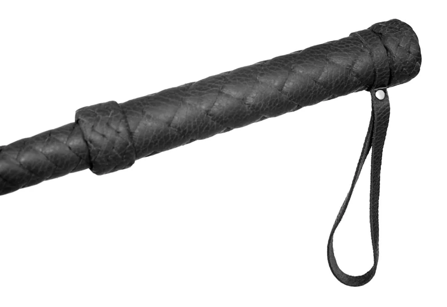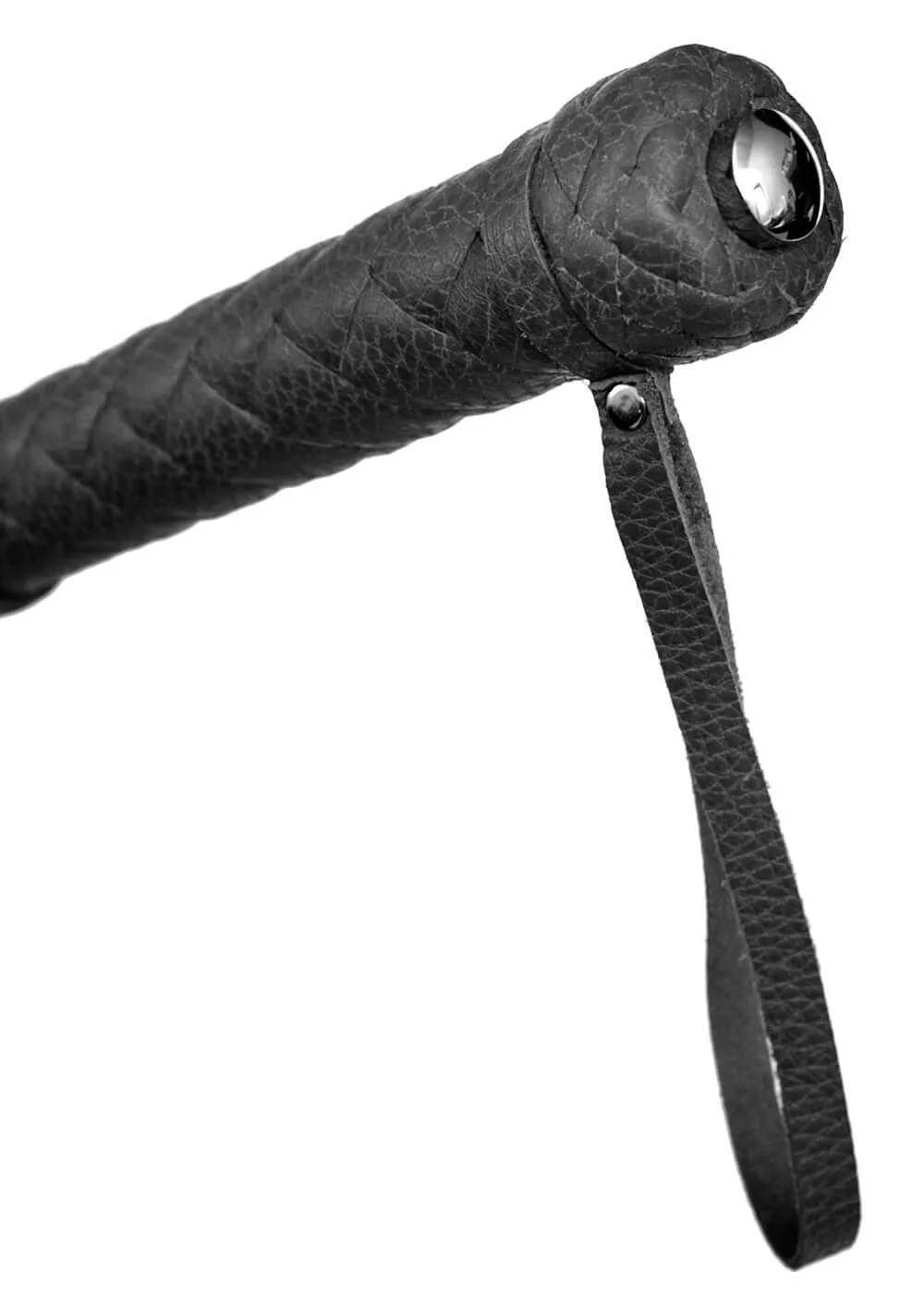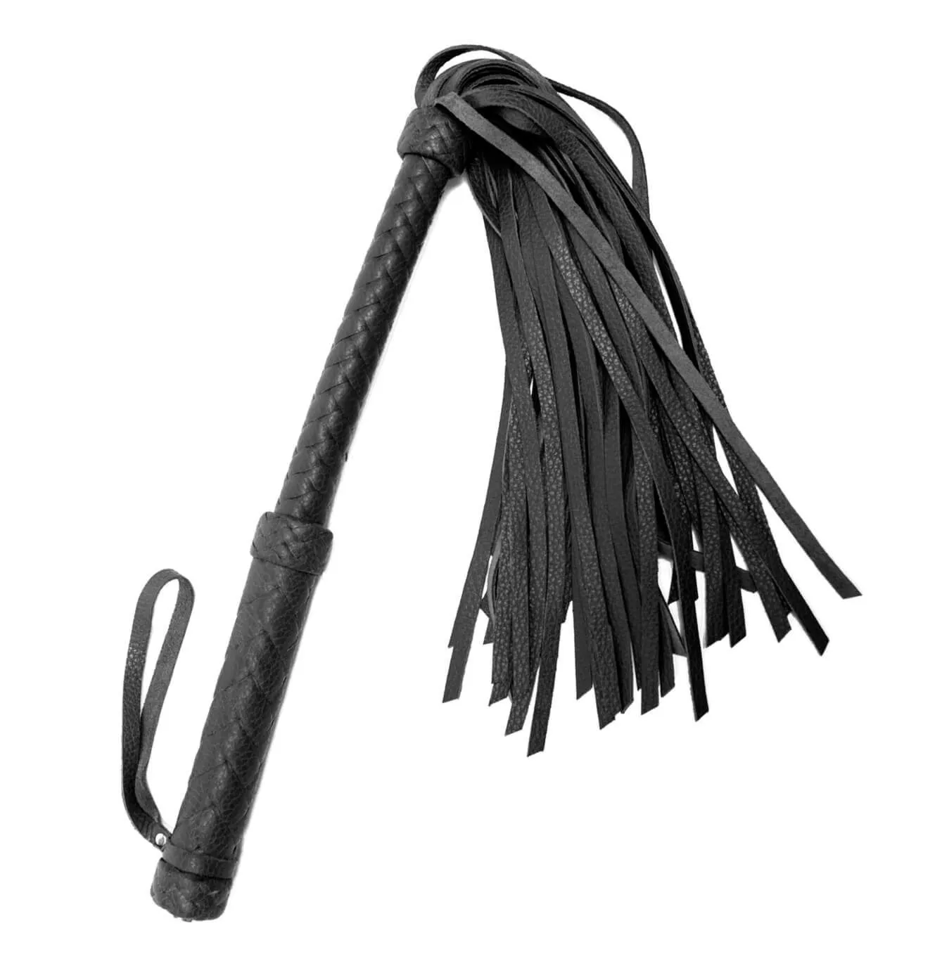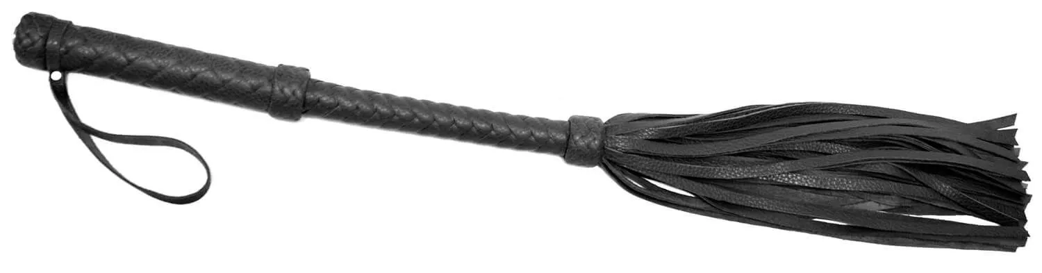 Флогер со множеством хвостов и плетеной рукояткой выполнен из натуральной кожи черного цвета. На конце рукоятки есть петелька для запястья.