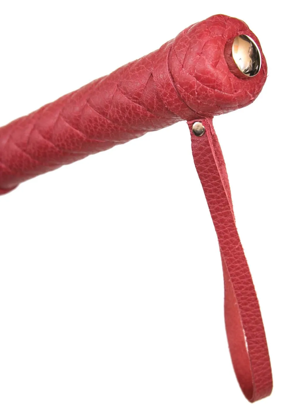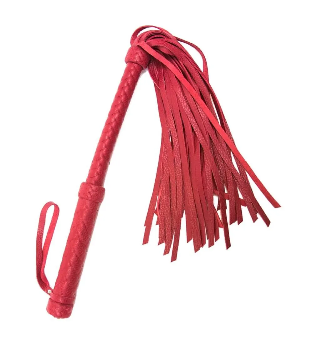 Флогер со множеством хвостов и плетеной рукояткой выполнен из натуральной кожи красного цвета. На конце рукоятки есть петелька для запястья.