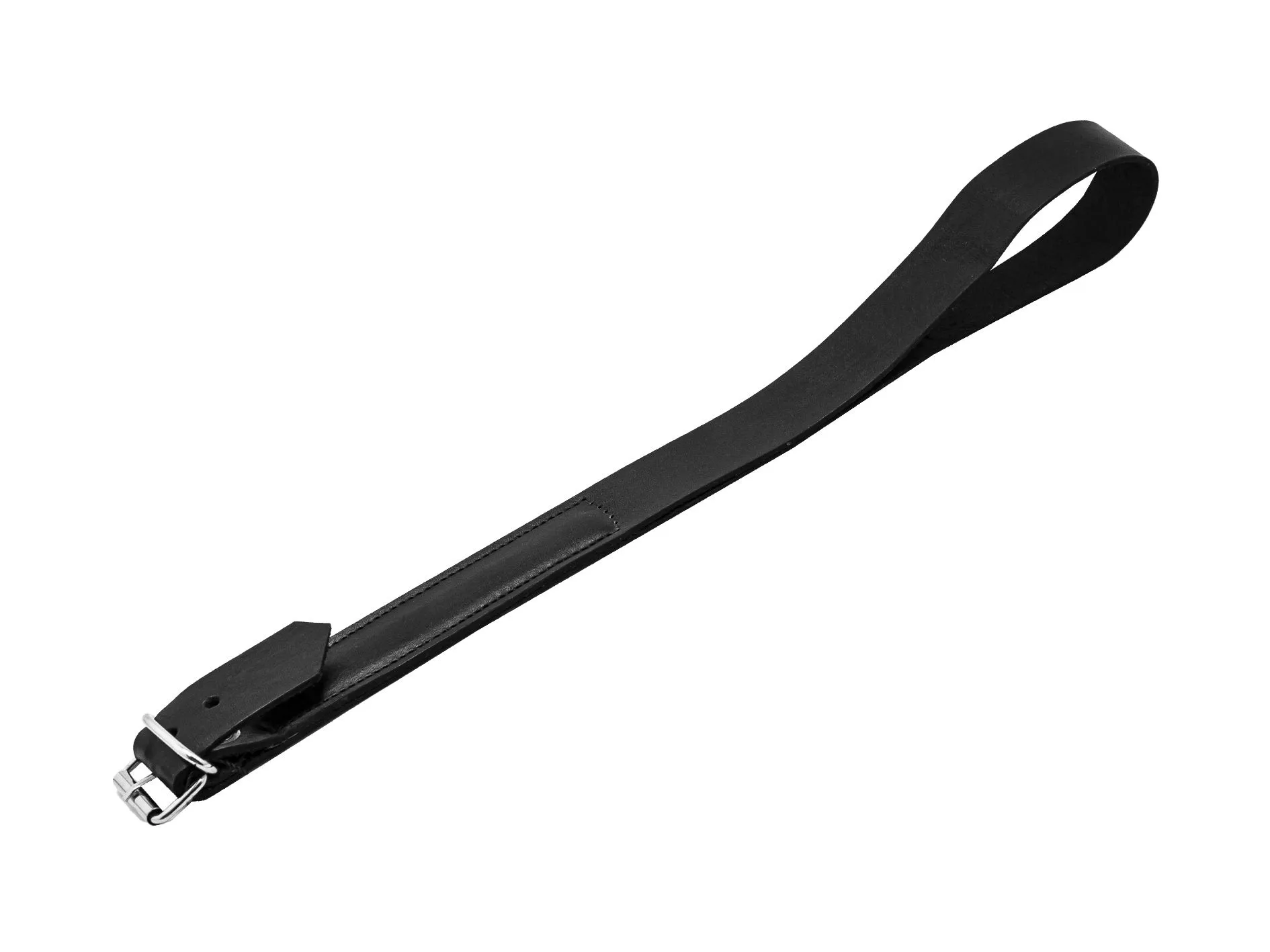 Мягкий спанкер выполнен из черной матовой кожи в виде ремня. "Ручка" украшена пряжкой.