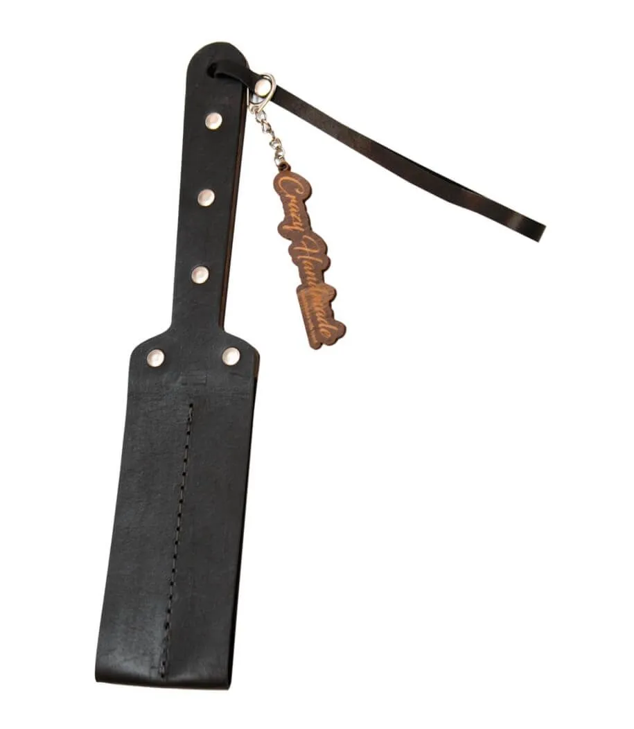 Эта шлепалка представляет собой мягкий паддл, выполненный из натуральной кожи черного цвета и дерева. С таким девайсом Ваши игры с элементами БДСМ станут еще более страстными и полными острых ощущений. Отшлепайте своего партнера, нанося ощутимые удары, чтобы показать ему его место и заставить повиноваться. Или же поощрите его нежными поглаживаниями за хорошее поведение. На ручке имеется кожаная петелька для запястья, благодаря которой паддл не выскользнет из Ваших рук. Внутри ручки есть деревянная вставка, поэтому она не будет сминаться.
