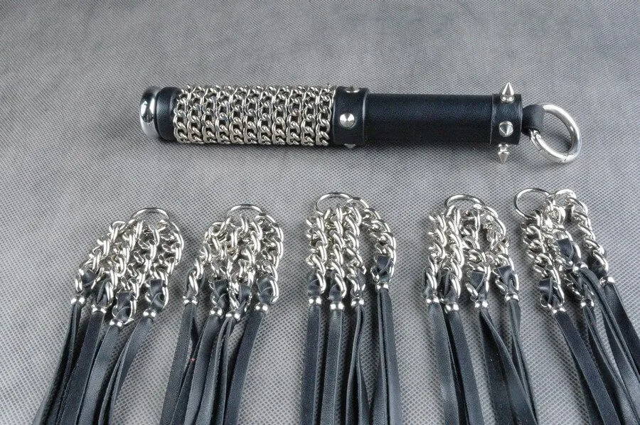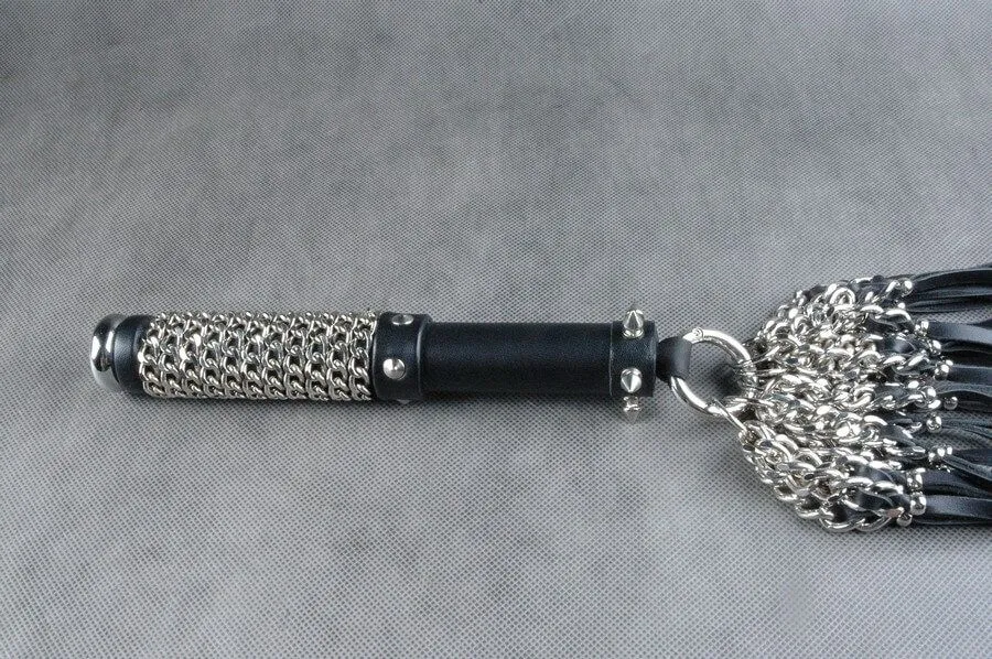 Поворотно-вращающийся флогер "Полный улет" от российского бренда Beastly сделан из натуральной кожи черного цвета и металлических цепей с алмазной гранью. Декор представлен в виде небольших шипиков. В основании рукояти - плоское металлическое навершие, место хвата обвито цепочкой. Ударная часть флогера состоит из карабинного кольца, к которому присоединены 5 пучков хвостов. Подвижность в работе обеспечивают именно цепочки с вплетенными хвостами на кольцах.