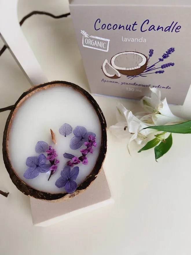 Наполните свой дом тёплым светом и лёгким ароматом при помощи свечи в кокосовой скорлупе с маслом лаванды. Кокосовый воск медленно плавится, заставляя лаванду отдавать свой царский аромат. Деревянный фитилёк, словно камин, издаёт при горении треск и погружает вас в состояние релакса и комфорта.