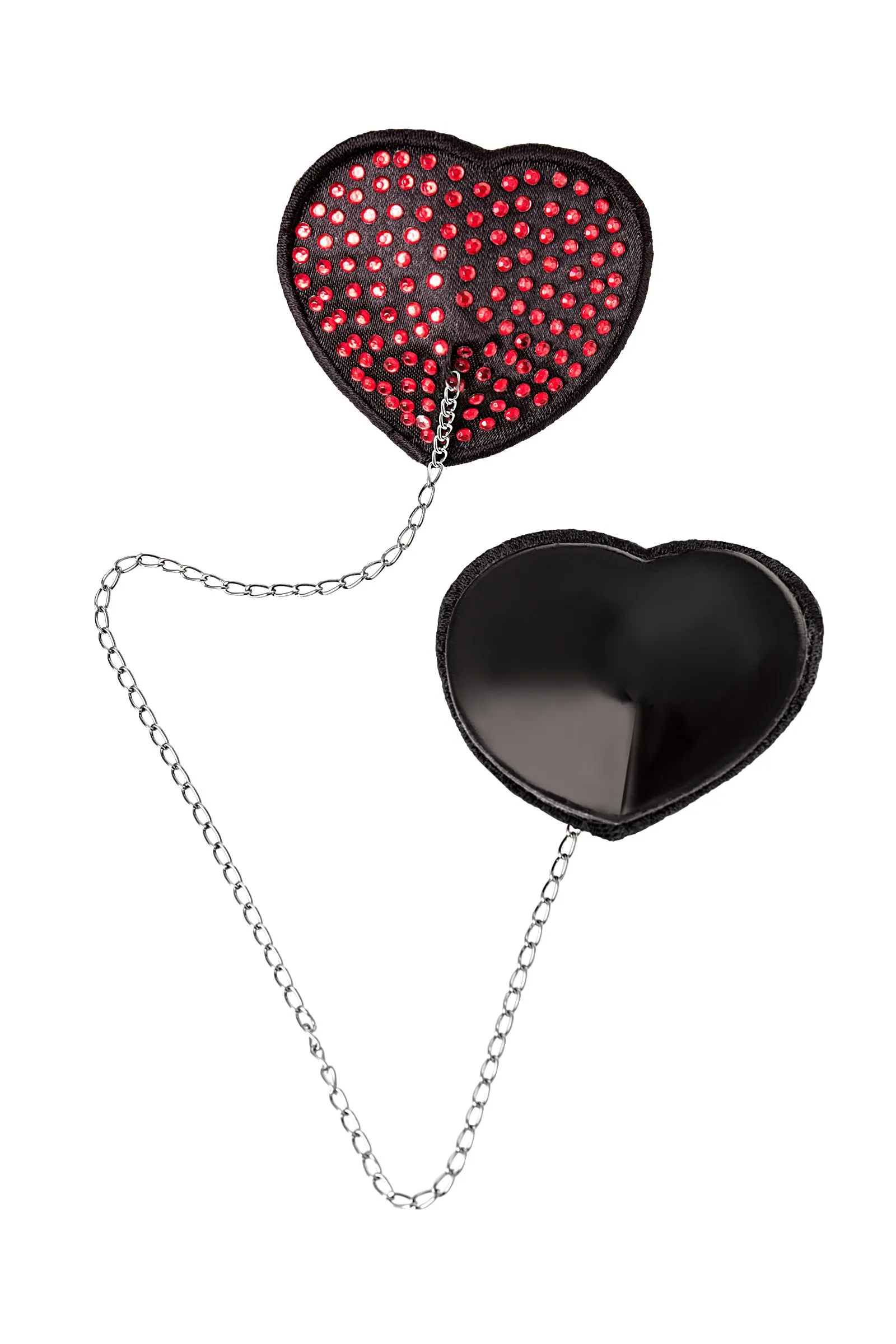 Наклейки на соски многоразовые. Конус выполнен из полиуретана, внутри — слой силиконового геля. Декор: сатин со стразами и серебристая металлическая цепочка. Размер основания: 5 см. Длина цепочки: 28 см. Наклеивать на чистую кожу без следов косметических средств. Снимать осторожно. После использования внутреннюю сторону промыть теплой водой. Хранить, изолировав клейкий слой пленкой или приклеив к стеклянной поверхности (зеркалу). Не использовать при гиперчувствительности к силикону, нарушениях пигментации или повреждениях кожи груди.