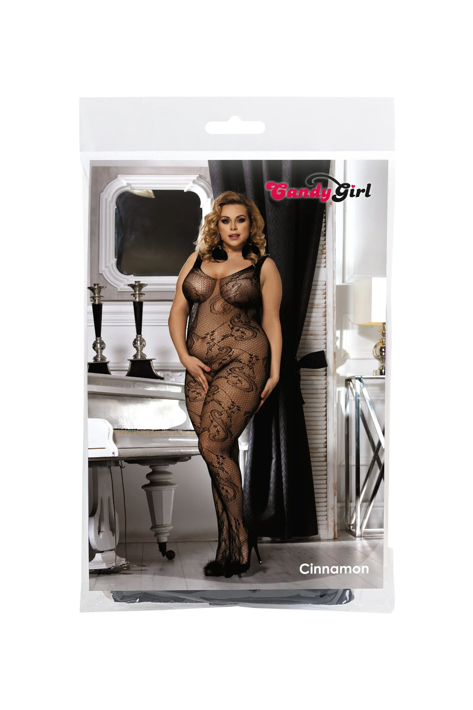 Эластичный костюм из бесшовной сетки с оригинальным узором Candy Girl® Cinnamon идеально садится по фигуре. Вырез в интимной зоне и усиленные носочки обеспечивают комфорт при использовании.