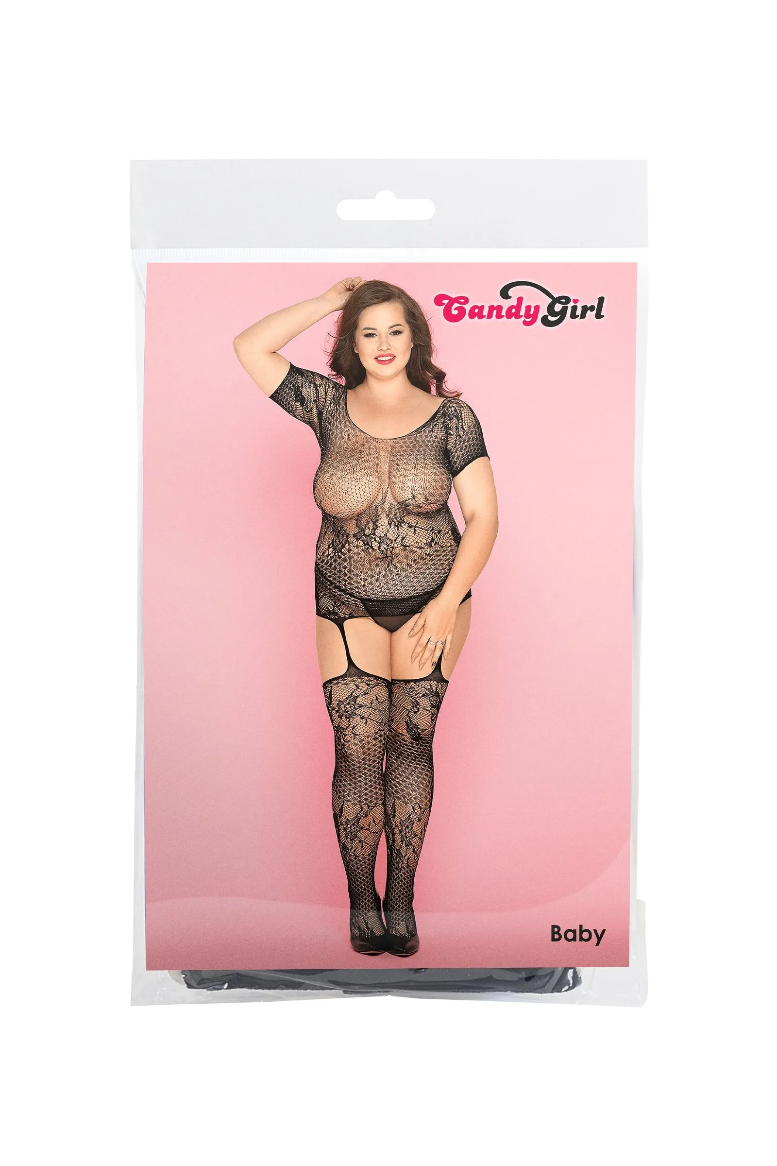 Эластичный бесшовный костюм-сетка из топа с короткими рукавами и чулок Baby от Candy Girl®. Сочетание ажурного и геометрического рисунков плетения притягивает взгляд. Стринги и усиленные мыски чулок обеспечивают комфорт при использовании.