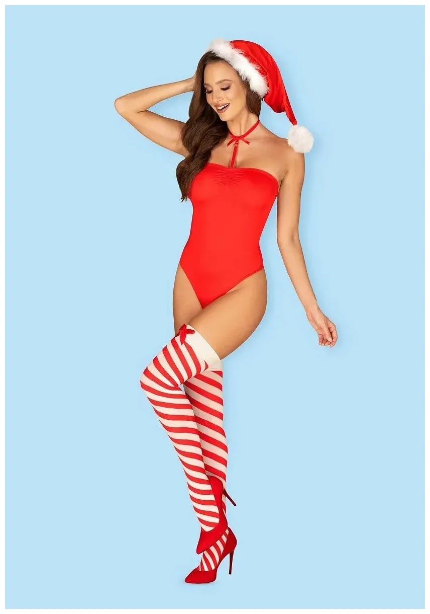Очаровательное боди Kissmas выполнено из эластичного материала, без бретелей c силиконовой полоской вверху. В комплекте чокер из эластичных ремешков, чулки и новогодняя шапка.