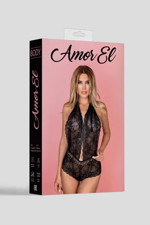 Кружевной черный боди с фиксацией на шее, голой спинкой и доступом.
