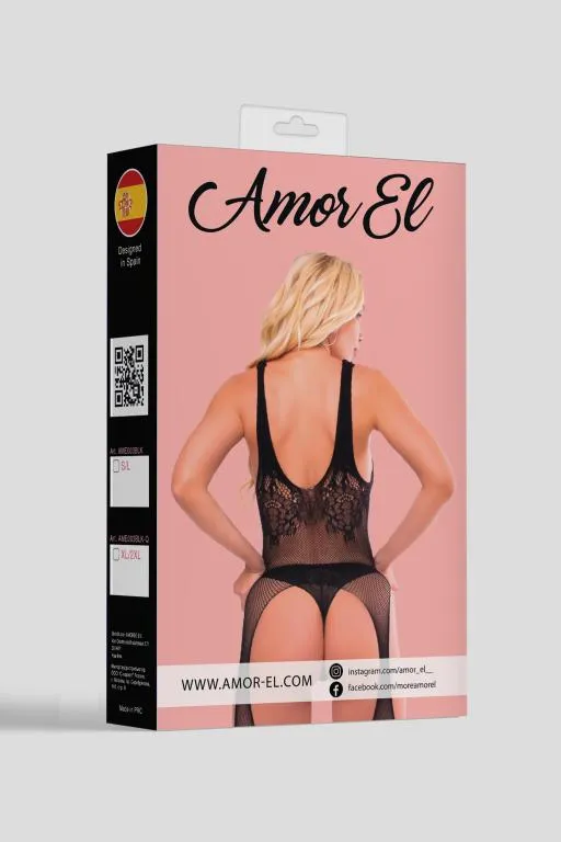 Blanca - боди-комбинезон с имитацией чулок. Дизайн выполнен в виде контрастного полупрозрачного рисунка.