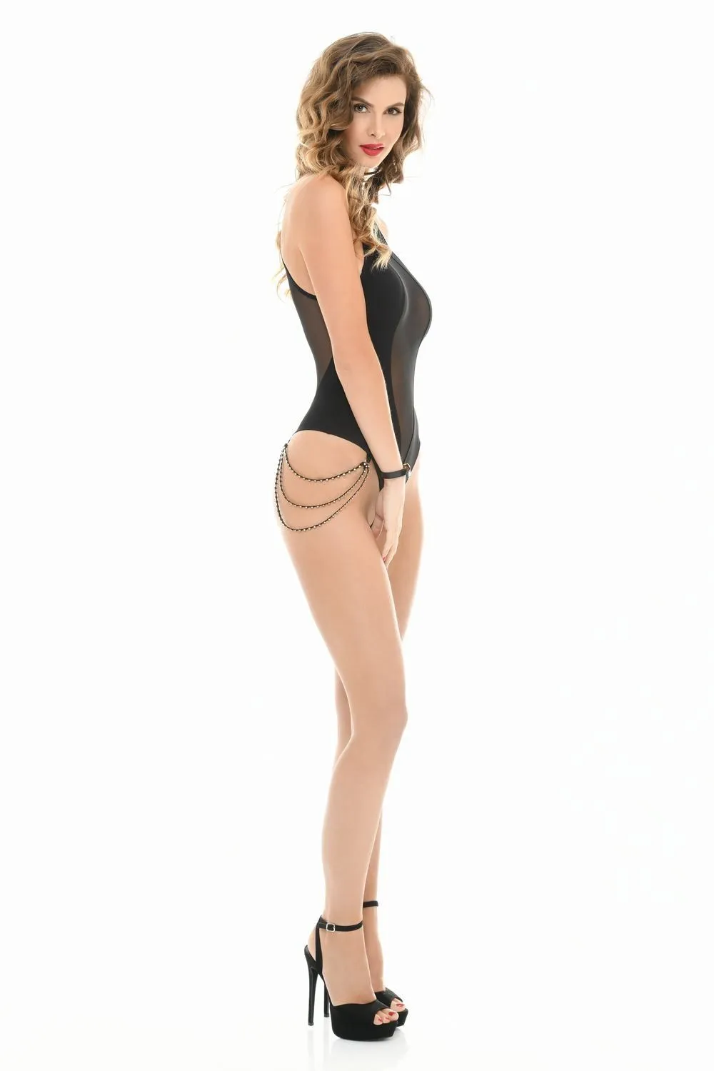 Боди Mandy из коллекции Les P'tites Folies collection, Volume 8 от французского модельера Patrice Catanzaro выполнено из тонкого тянущегося материала в сочетании с мелкой сеткой. Вставка из прозрачной сетки спереди, доходящая до самого низа живота, дразняще намекнет на очертания груди, но так и не позволит увидеть лишнего. Боди декорировано тремя лентами, которые будут свободно ниспадать по бедру. Также у него есть воротничок с тремя золотистыми кнопками, напоминающий по своему дизайну чокер.