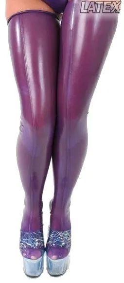 Роскошные, блестящие, гладкие и создающие эффект струящейся воды фиолетовые латексные чулки украсят Ваши стройные ножки. Любой мужчина потеряет голову при виде раскрепощенной леди в таком сексуальном аксессуаре.