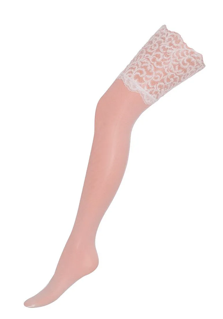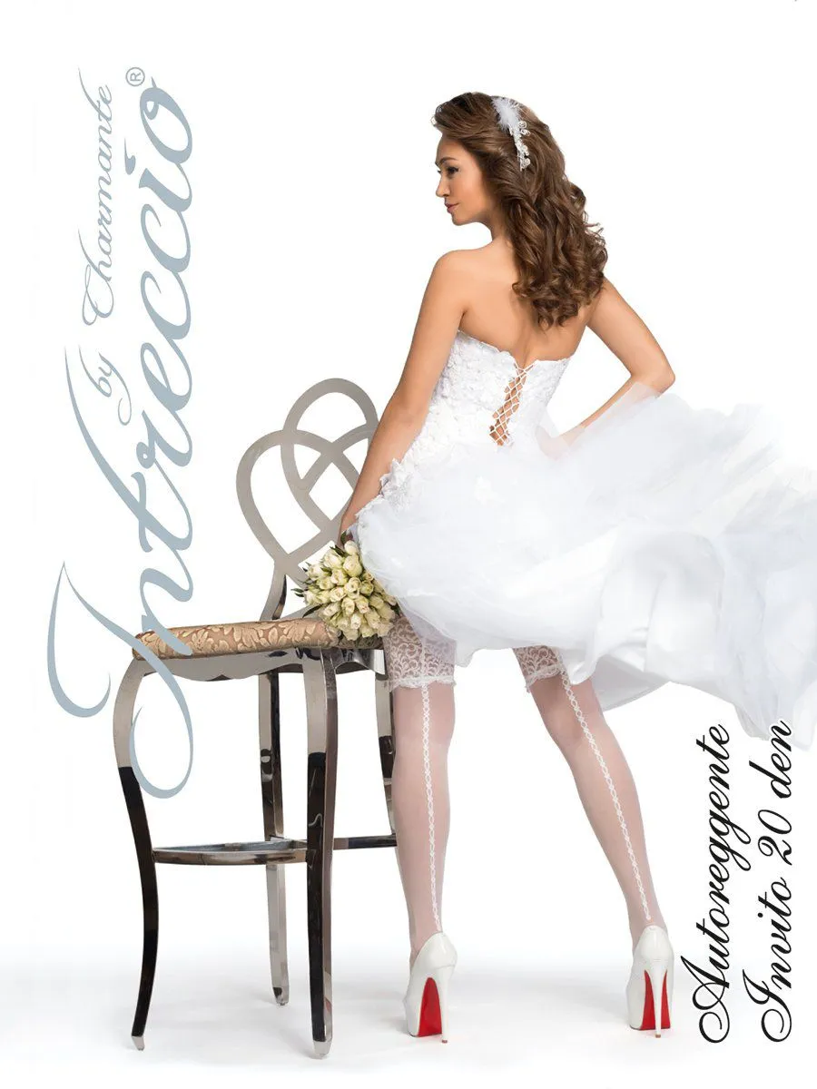 Свадебные чулки из белого полиамида с широкой кружевной резинкой и вывязанным швом-стрелкой по задней детали. Силиконовая резинка – для особого комфорта.