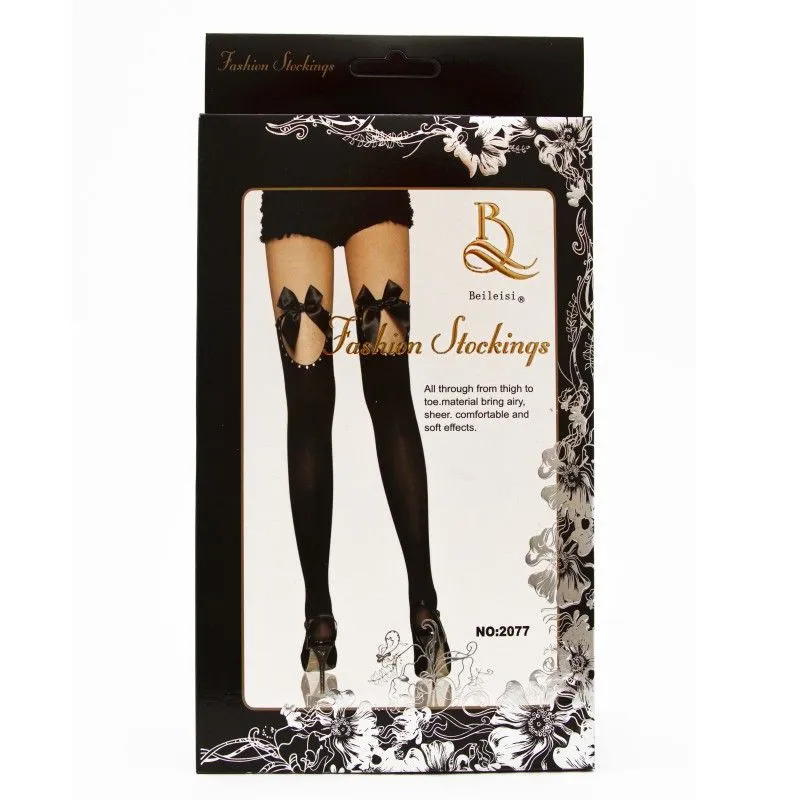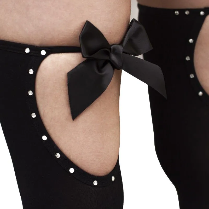 Черные чулки из плотного нейлона тоже могут выглядеть оригинально и необычно. Данная модель это полностью подтверждает. Игривые вырезы сзади, украшенные сияющими стразами, и кокетливые черные бантики демонстрируют особый вкус владелицы чулок. Она явно вознамерилась сегодня кого-то соблазнить, и нет никакой причины, чтобы ей это не удалось.