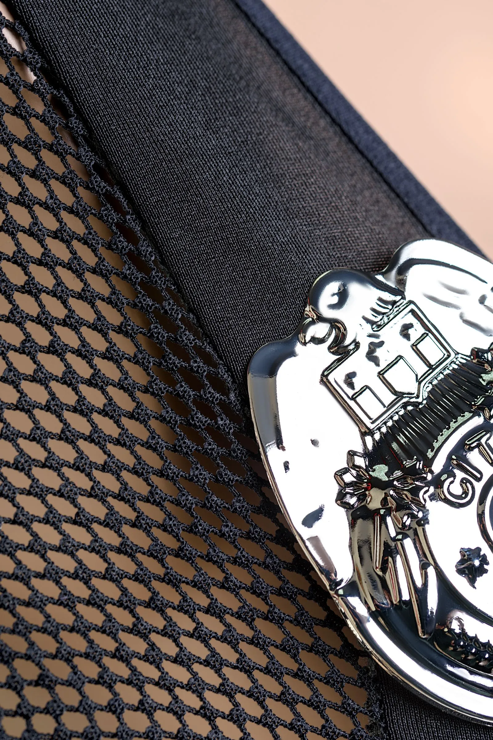 Костюм полицейского Candy Girl® Cayenne из топа на завязках со значком City Police (англ. «Городская полиция») и юбки в виде набедренной повязки позволяет эротично развязать комплект и добавить игривости в моменте. Сочетание непрозрачного трикотажа и крупной сетки, сквозь которую проглядывает голое тело, выгодно подчеркивает роскошные формы. Т-стринги и кепка со вторым значком City Police идеально дополняют образ.