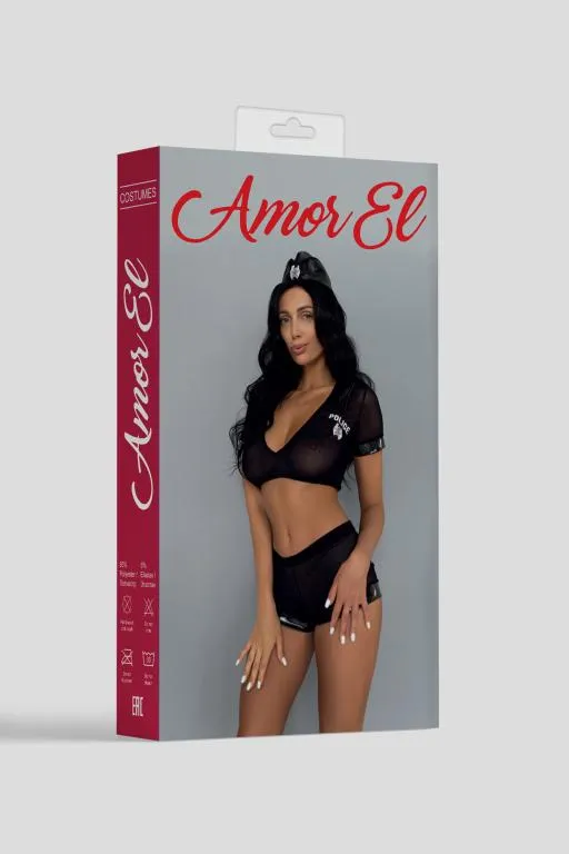 Комплект полицеского состоящий из сетчатой ткани выгодно подчеркивает фигуру и добавляет образу строгости. В комплект входит: топ со значком, мини-шортики на резинке, пилотка.