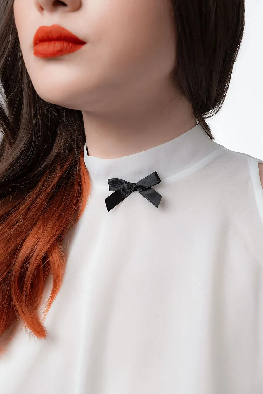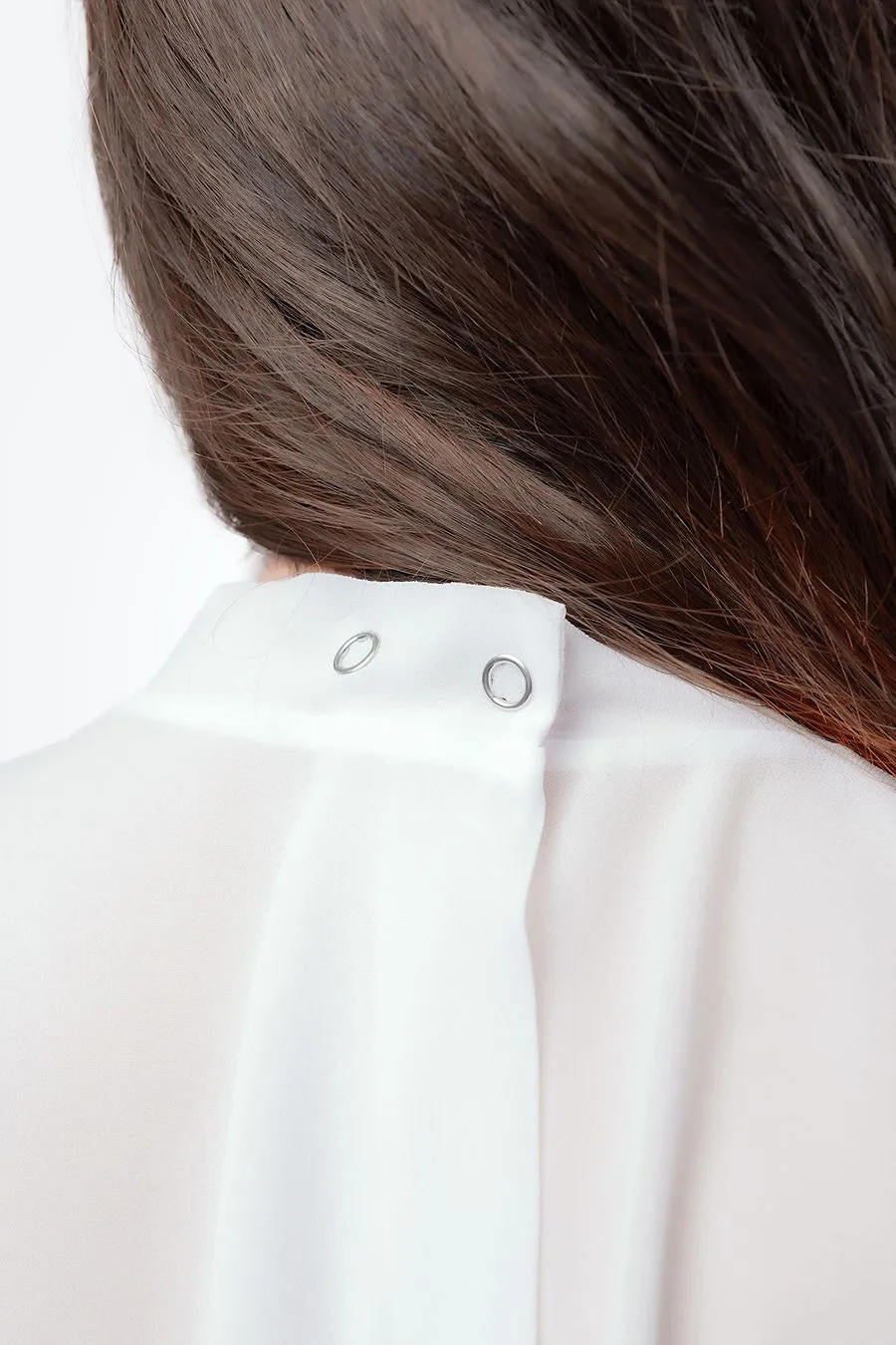 Прямая юбка из трикотажной лаковой кожи скрывает животик, даёт небольшую коррекцию силуэта, подчеркивает талию и бедра. Двусторонняя молния сзади добавляет элемент игры и позволяет открыть ягодицы для демонстрации сверху, снизу или с другого ракурса, который придет в голову. Невесомый прозрачный топ из шифона держится на паре кнопочек сзади, не сковывает движений, соблазнительно струится по телу, подчеркивает грудь и обнажает спинку. Воротник-стойка, украшенный игривым бантиком привлекает внимание к взъему груди. Каждое движение в этом легком топе будет волновать воображение и приковывать взгляд.