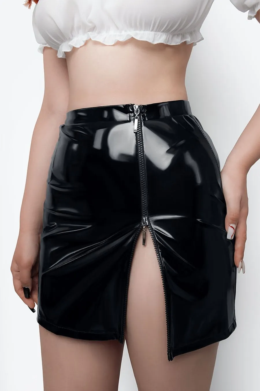 Прямая юбка из трикотажной лаковой кожи скрывает животик, даёт небольшую коррекцию силуэта, подчеркивает талию и бедра. Двусторонняя молния спереди визуально удлиняет ноги и добавляет элемент игры - скинуть юбку можно в одно мгновение. Невесомый прозрачный топ из шифона придает груди соблазнительный объем, подчеркивает ключицы и декольте, не сковывает движений. Рукава-фонарики дают возможность прикрыть плечи или наоборот - добавить образу обнаженности. Галстук на эластичной резинке с небольшим крючком сзади завершает образ и придаёт кокетства.