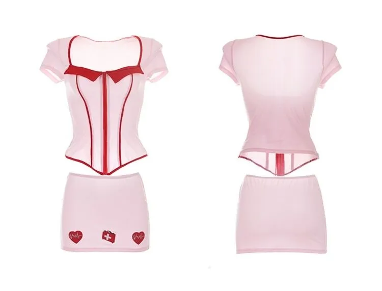 Этот эротический костюм перевоплотит Вас в соблазнительную медсестру, под чьим чутким присмотром захотел бы оказаться любой мужчина, желающий излечиться от своих "недугов". Мини-юбка акцентирует внимание на длинных ножках и визуально сделает ягодицы более округлыми. А облегающий топ с красным поясом подчеркнет стройность фигуры и выделит талию. На юбке и головном уборе есть принт в виде сердца, намекающий на то, что и сердце Вашего партнера будет биться быстрее при виде Вас.